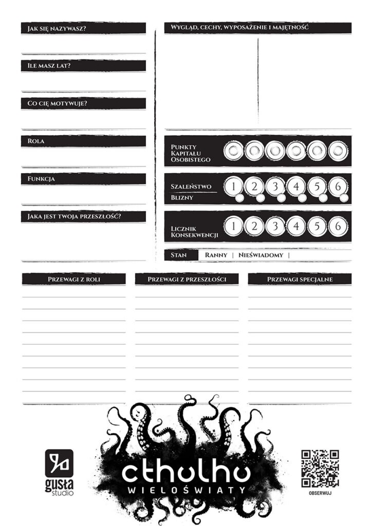 gry fabularne, RPG Cthulhu WieloświatyKARTA POSTACI (ogólna) POBIERZ gry karciane AniołowieINSTRUKCJA (druk A4) POBIERZ